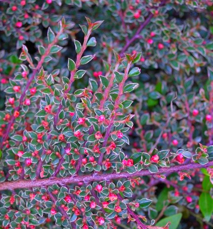 Cotoneaster atropurpureus 'Variegatus' est un arbuste couvre-sol retombant au feuillage panaché lumineux, idéal pour talus, murets, rocailles et bordures. Mellifère au printemps, il se couvre de baies rouges en automne, très attractives pour les oiseaux.