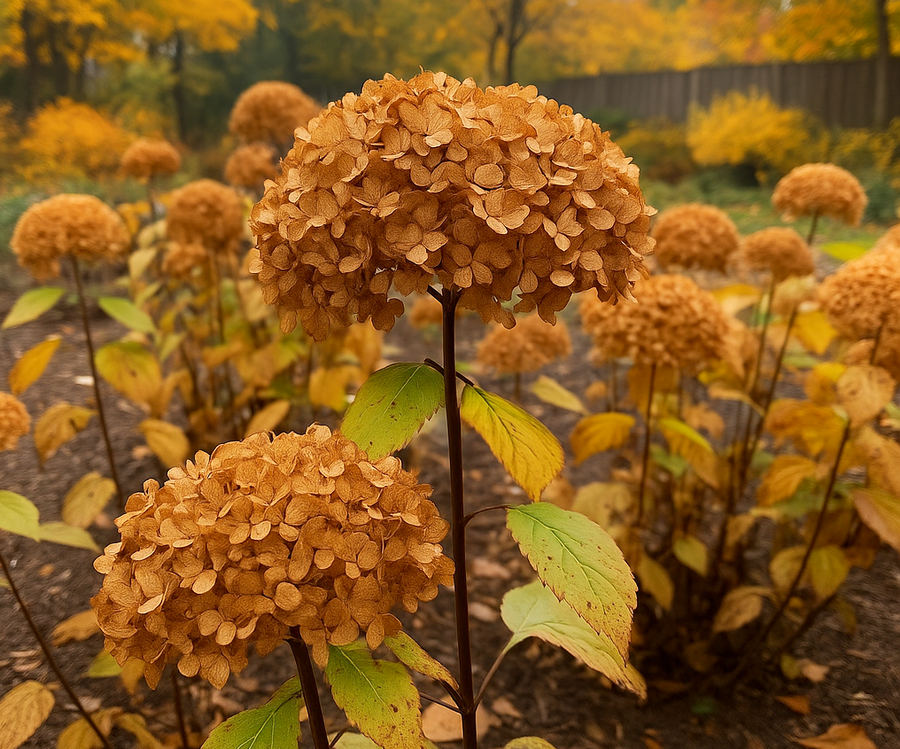 Août – septembre : Floraison prolongée. Quelques têtes virent à l’ivoire puis au vert pistache, prolongeant l’intérêt jusqu’aux portes de l’automne. Possibilité de couper pour bouquets frais ou séchés.