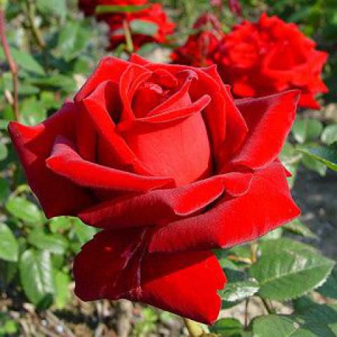 Ils bénéficient d’une floraison remontante, très généreuse de Mai jusqu’aux gelées, Ses fleurs de grande classe sont d'un rouge intense et velouté avec une très belle végétation.